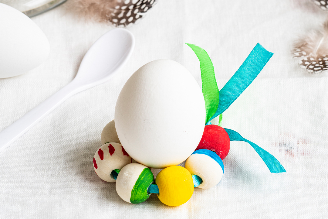 Mach Eierbecher aus Perlen, Farbe und Band. So wird der Ostertisch zu einem echten Eier-, ähm, Blickfang! Für Kinder ab 5 Jahren. Kosten je Kind 4,00 Euro inkl. aller Materialien.