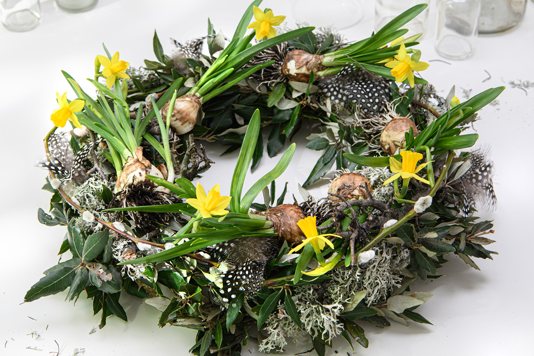 Komm und feier den Frühling mit uns. Erstelle einen Kranz aus natürlichen Materialien wie Steineiche, Lärche und Bonsaiholz. Du dekorierst ihn mit Narzissen, Moos, Weidenkätzchen und Federn. Dauer: 60 bis 90 Minuten. Kosten: € 27.95 pro Person, inklusive aller Materialien.